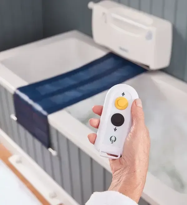 Press the down button the unit or remote control and the saddleband will gently lower you into the bath.